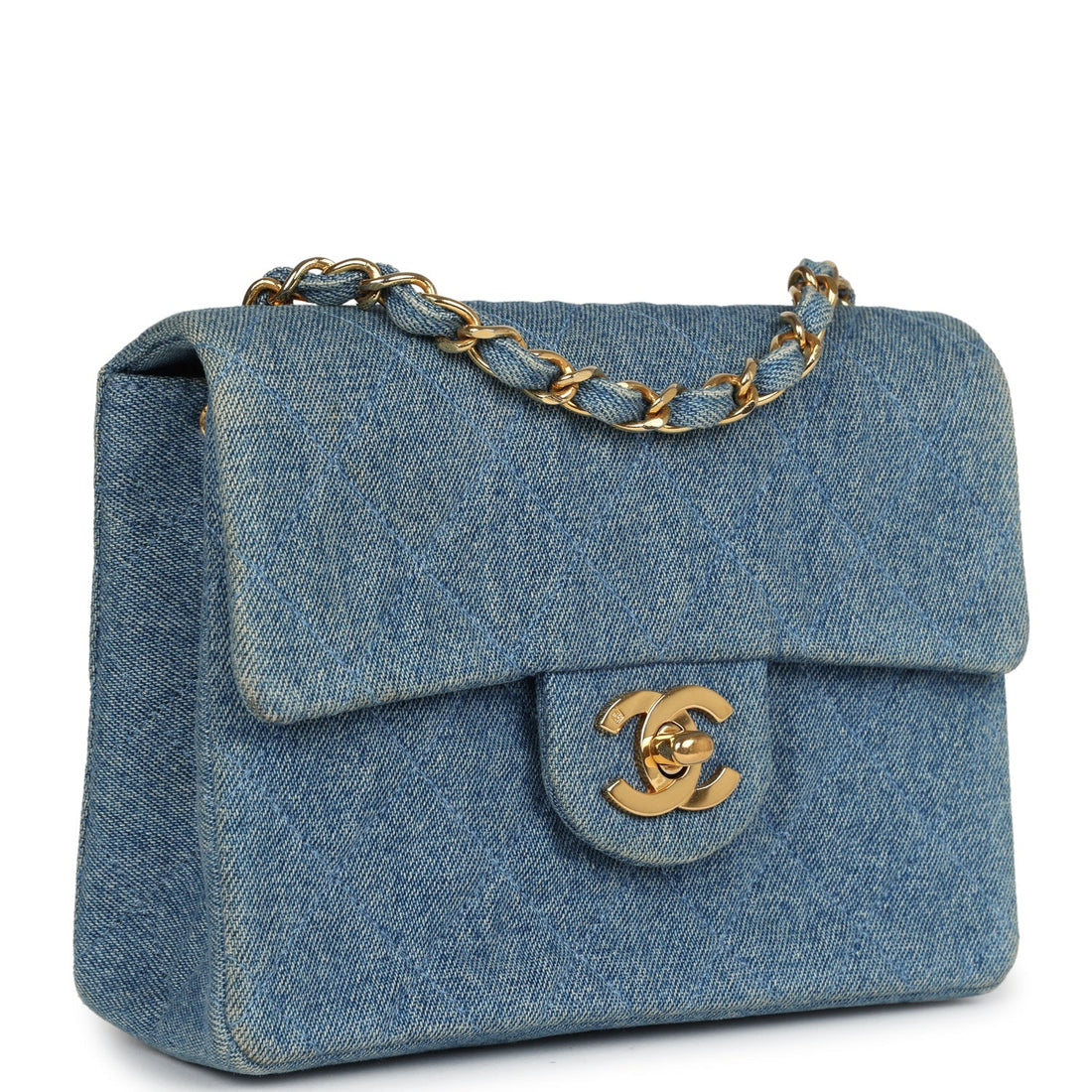 Vintage Chanel Mini Square Flap Bag Blue Denim Gold Hardware