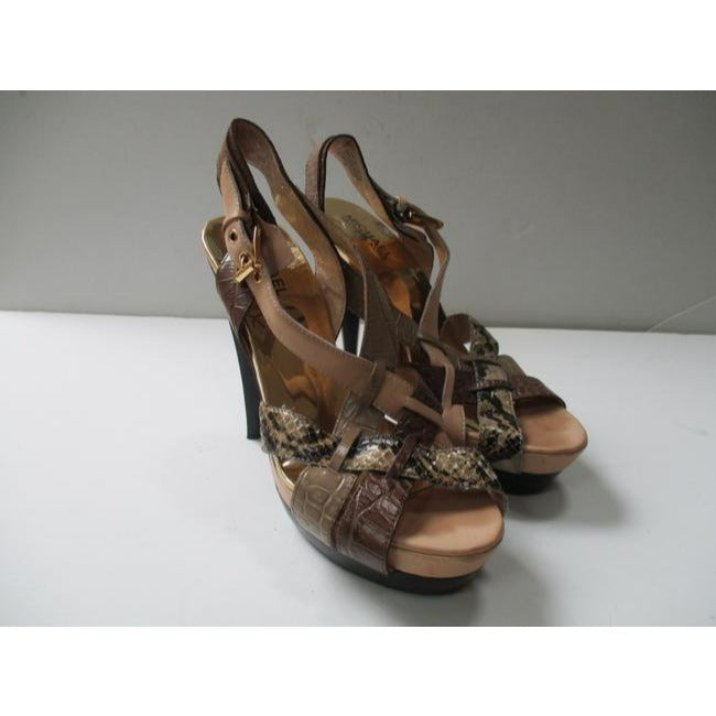 Michael Michael Kors Brown Taupe Beige Gold Edgy Strappy Mmk Croc Lizard Patent Open Toe Sandal Pump
