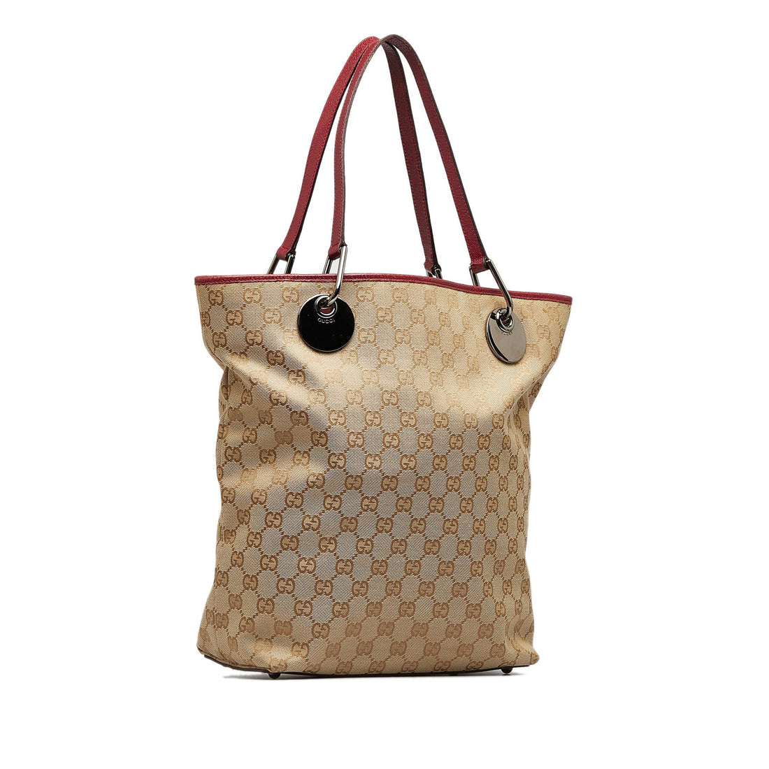 Product Details: Brown Gucci GG Canvas Jolicoeur Tote. The Jolicoeur features a canvas body, flat...