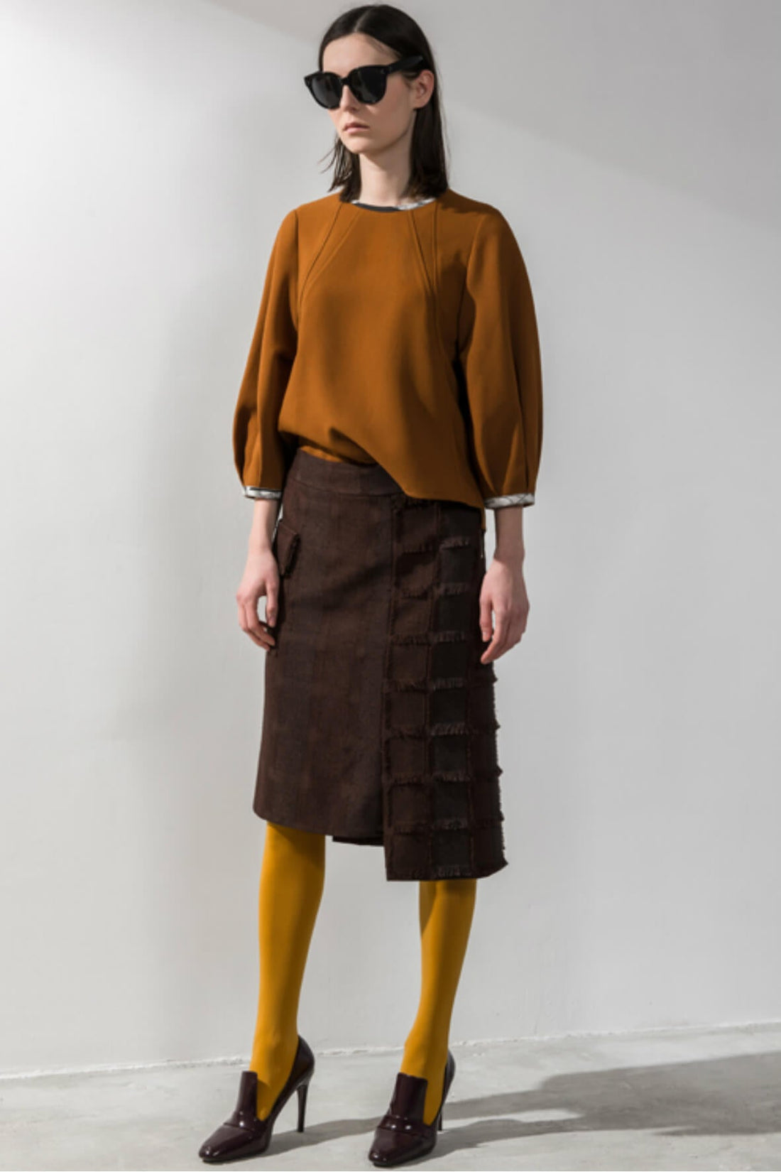 Description This caramel colored top is loose cut and with 3/4 puffy sleeves. The different...