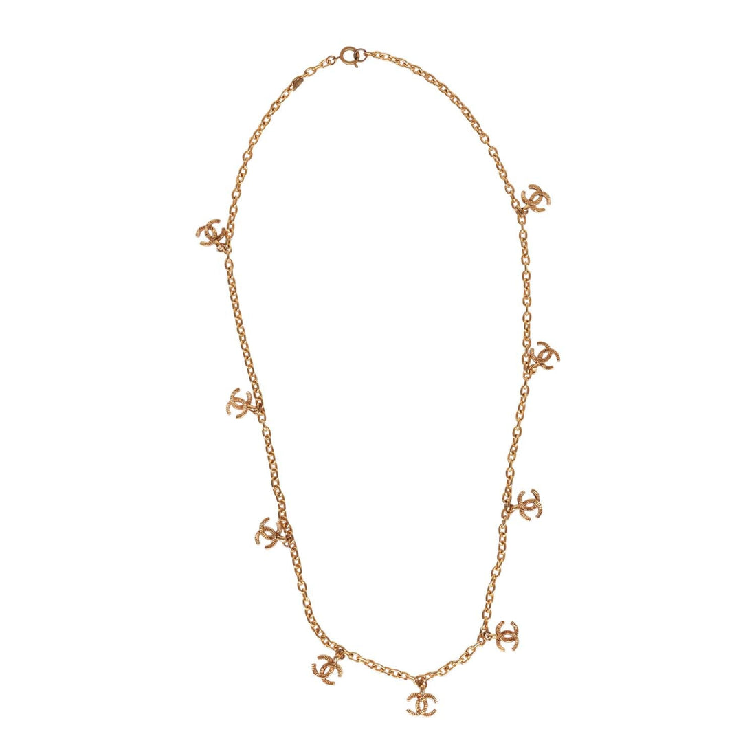 This Chanel vintage 24K gold plated necklace features nine interlocking CC logo charms on an...