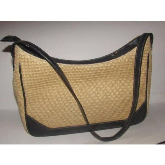 Vintage, Etienne Aigner, natural color woven raffia and navy blue leather, multi-compartment, shoulder purse
