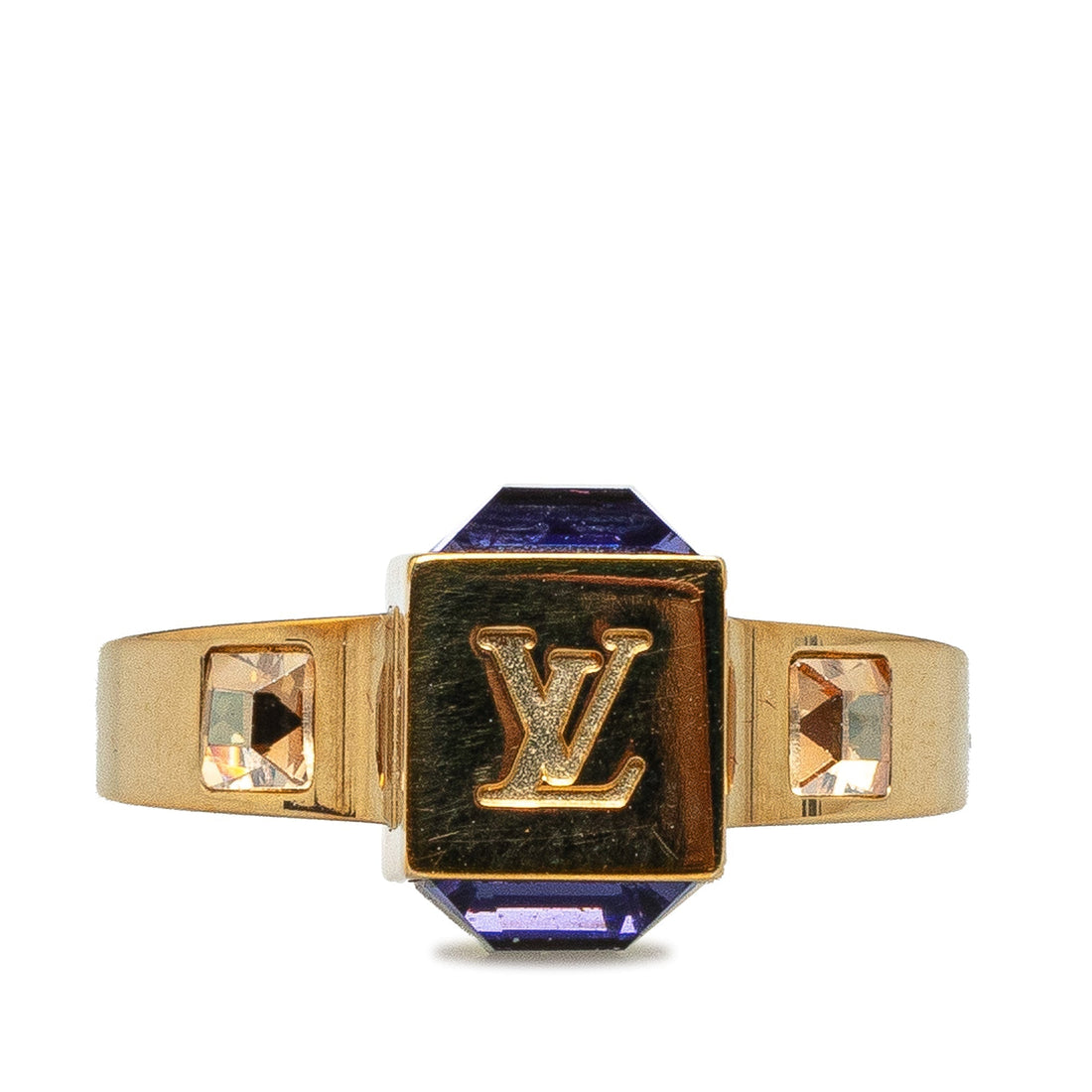 Product Details: Gold Louis Vuitton Crystal Gamble Cocktail Ring. This ring features a crystal embellishment...