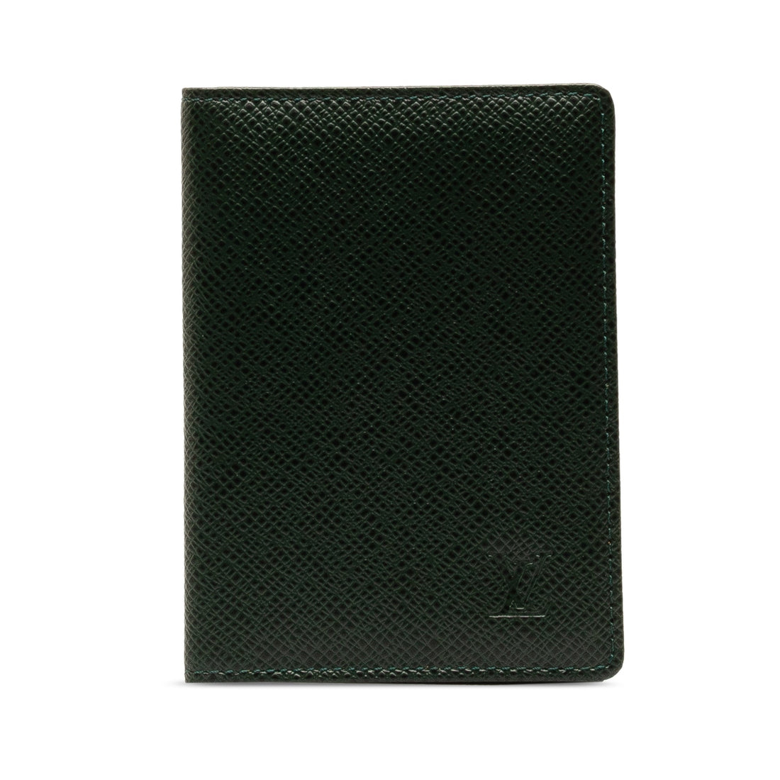 Product Details: Green Louis Vuitton Taiga Business Card Holder. This card holder features a leather...