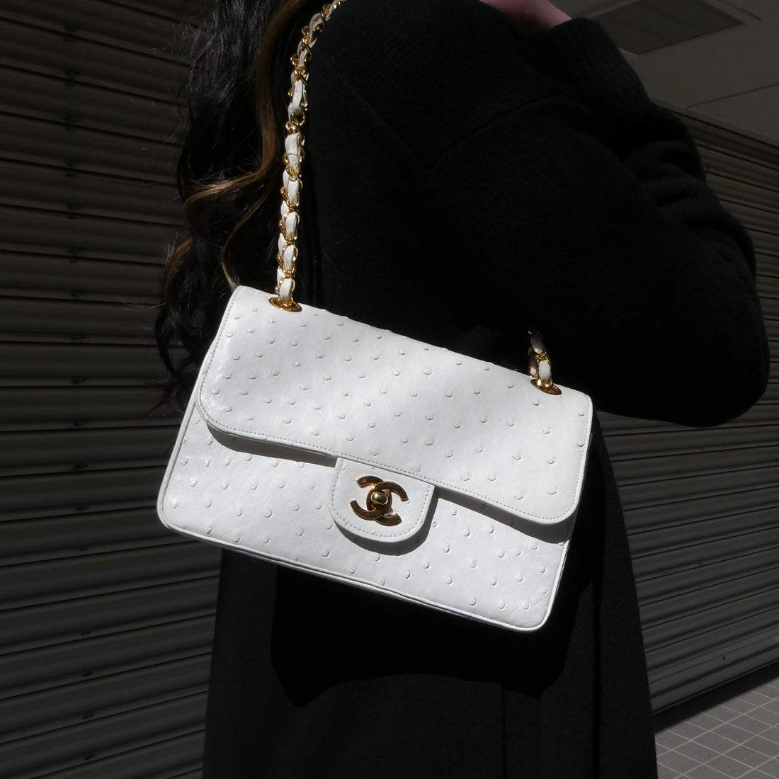 CHANEL * 1989-1991 Classic Double Flap Small White Ostrich
