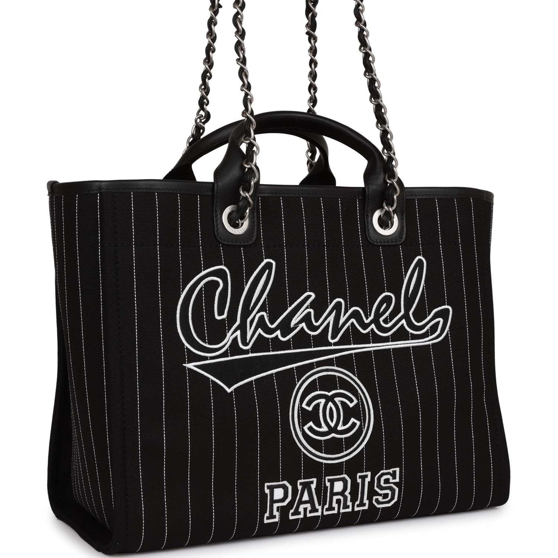 Chanel Large Deauville Shopping Bag Black and White Pinstripe Ruthenium Hardware