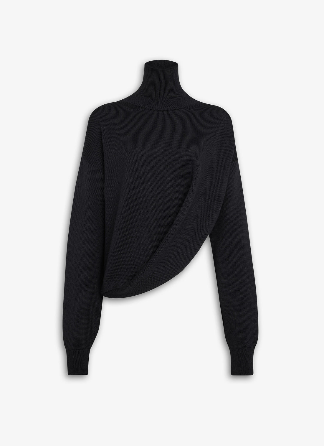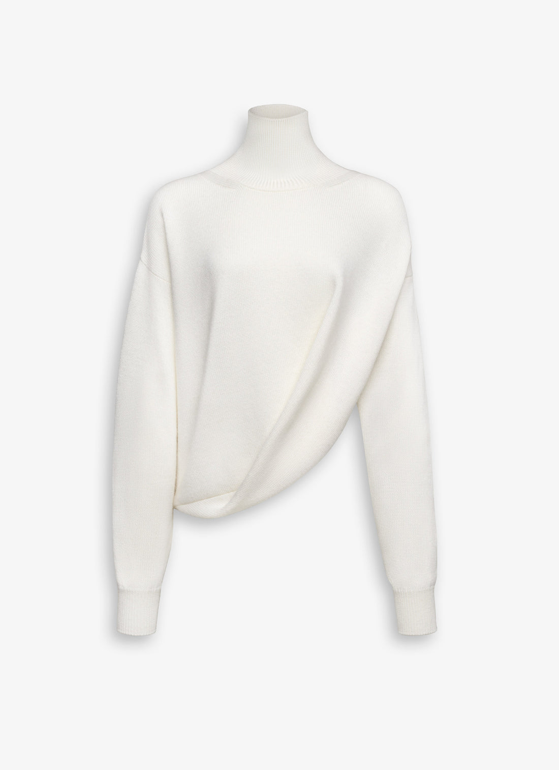 Asymmetrical knit jumper Long sleeves High neck Ribbed cuffs and neckline Knitted in wool Made...