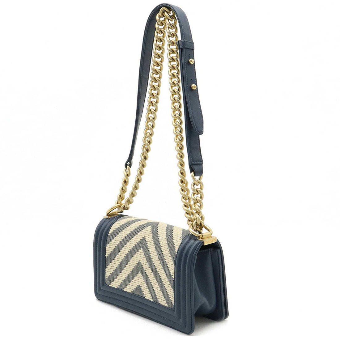 Chanel Boy V Stitch Chain Bag Shoulder Clutch Fabric Leather Navy Natural