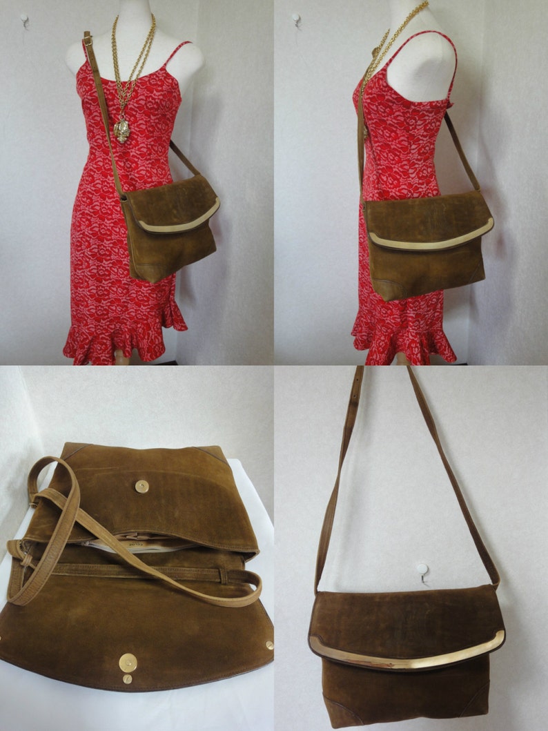 Celine Vintage genuine suede tanned brown leather shoulder bag, clutch purse with golden frame flap and embossed macadam blason logo