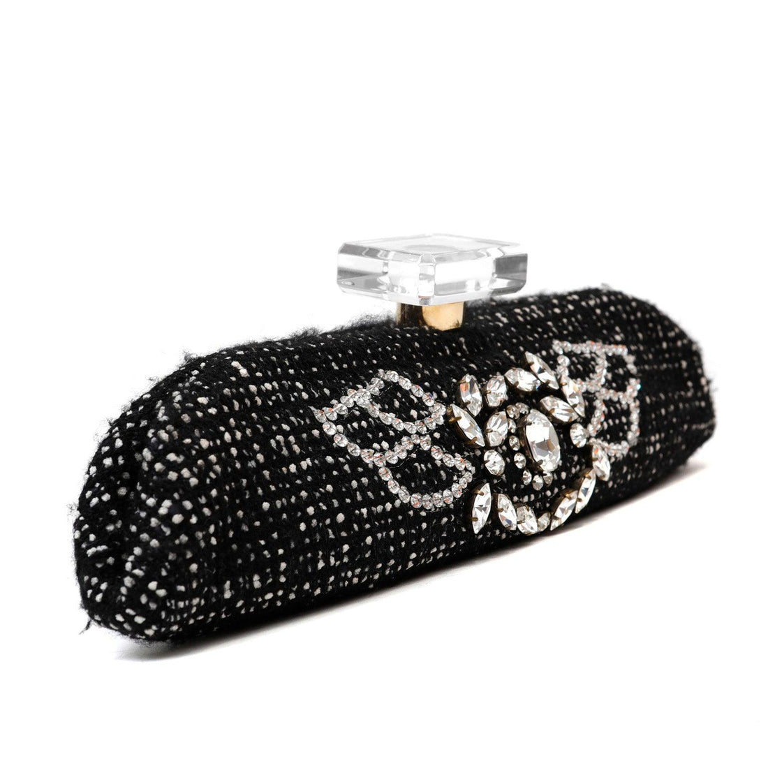 Chanel Runway 1990s Rhinestone Perfume Bottle Black Tweed/Leather Clutch