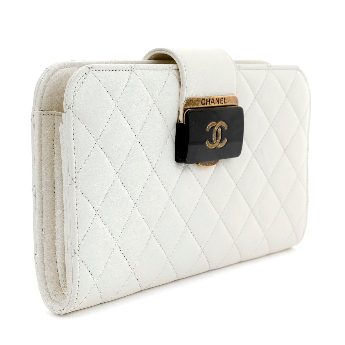 Chanel Black and White Lambskin Square Stitched Clutch with Lucite Knob