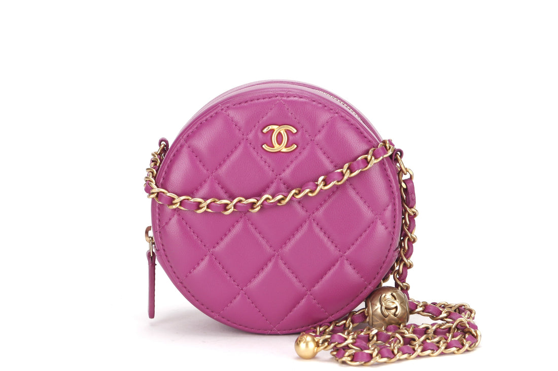 CHANEL PEARL CRUSH ROUND CLUTCH WITH CHAIN (3086xxxx) PURPLE LAMBSKIN GOLD HARDWARE, WITH , DUST COVER & BOX