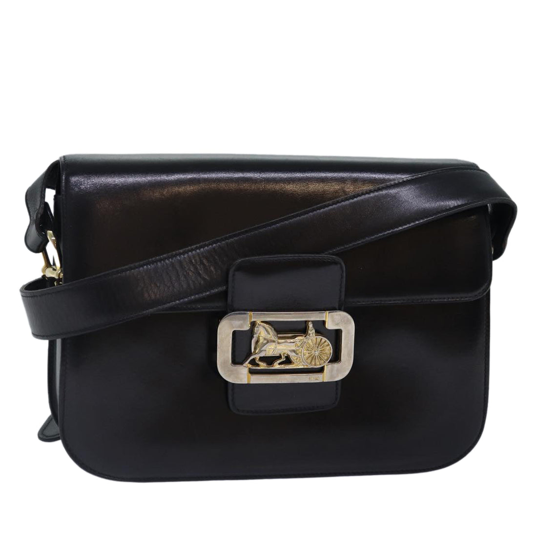 CELINE Horse Carriage Metal Shoulder Bag Leather Black Gold Auth fm3724