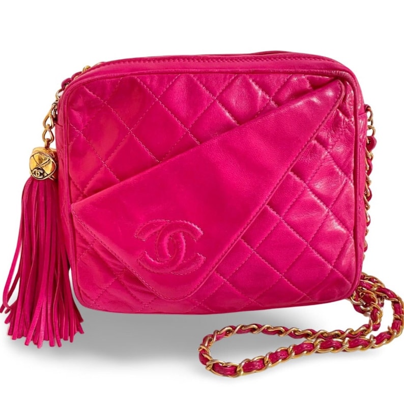 Vintage Chanel bright pink/fusia pink lambskin collar flap design classic camera type chain shoulder Bag...