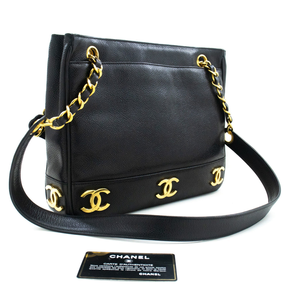 CHANEL Caviar Triple Coco Chain Shoulder Bag Black Leather Gold