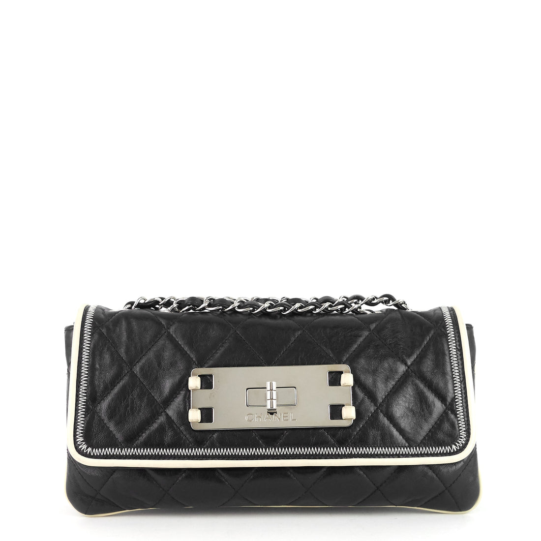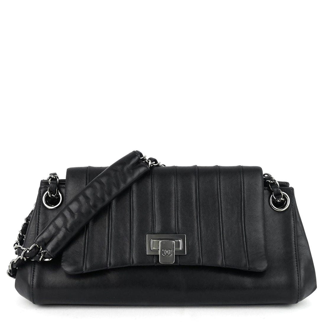 Black piping outlines the rectangular silhouette of a lambskin shoulder bag fitted with an oversized mademoiselle...