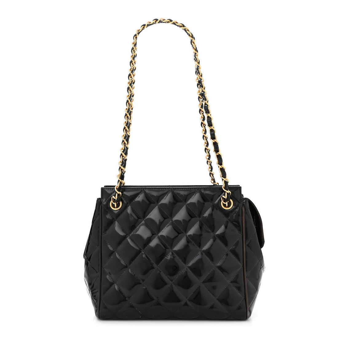 Elevate your style with the timeless elegance of the Chanel Patent Quilted CC Shoulder Bag...