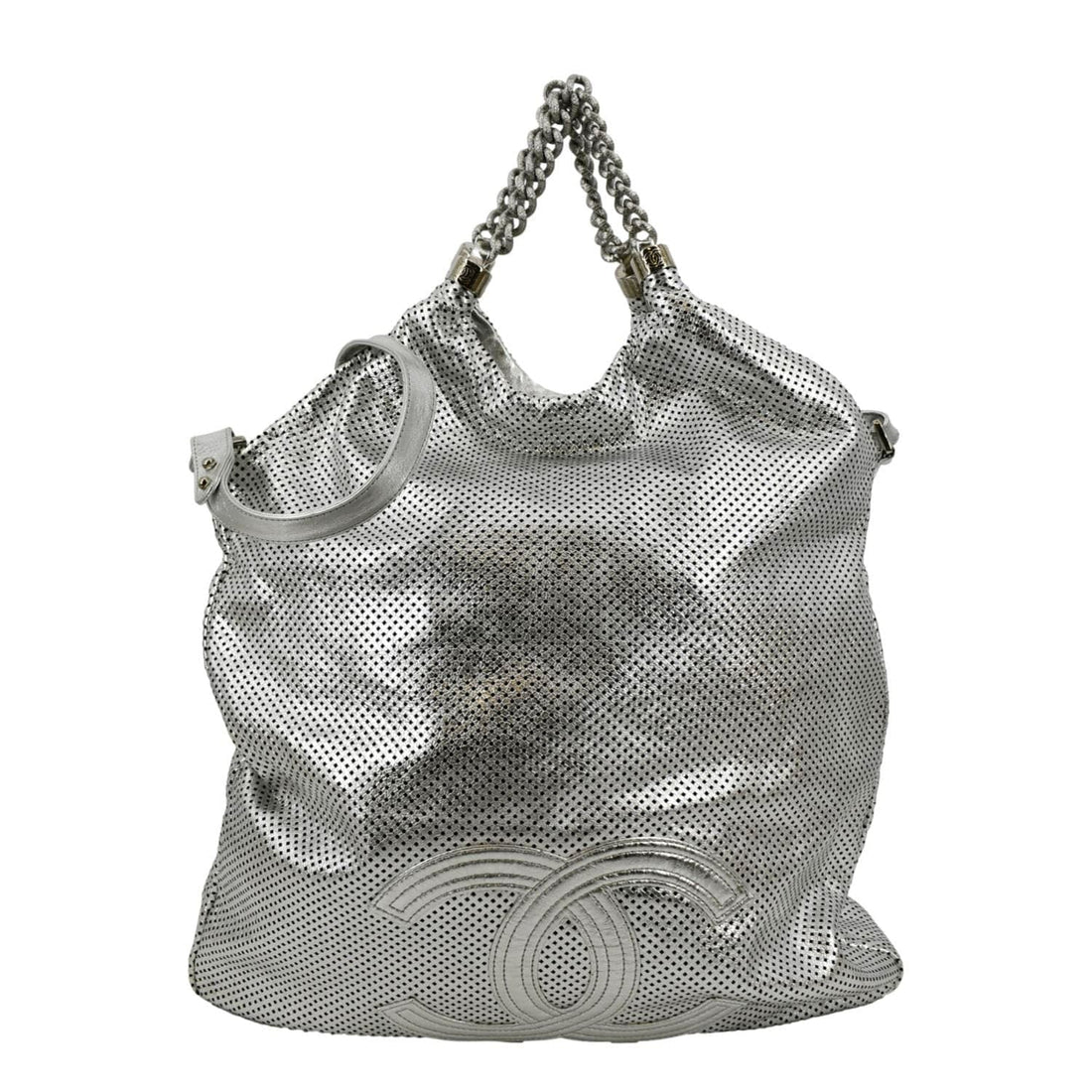 CHANEL Rodeo Drive Perforated Leather Shoulder Bag Metallic Silver