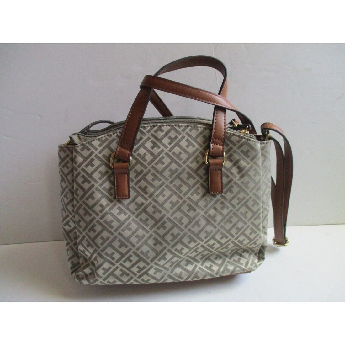 Tommy Hilfiger Classic Tan Taupe Signature Canvas Red Logo Two Way Satchel