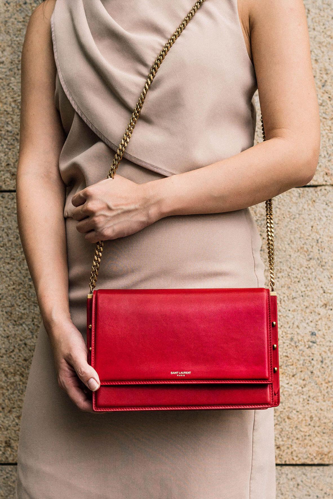 The bag features a waist length chain link shoulder strap in gold and a facing...