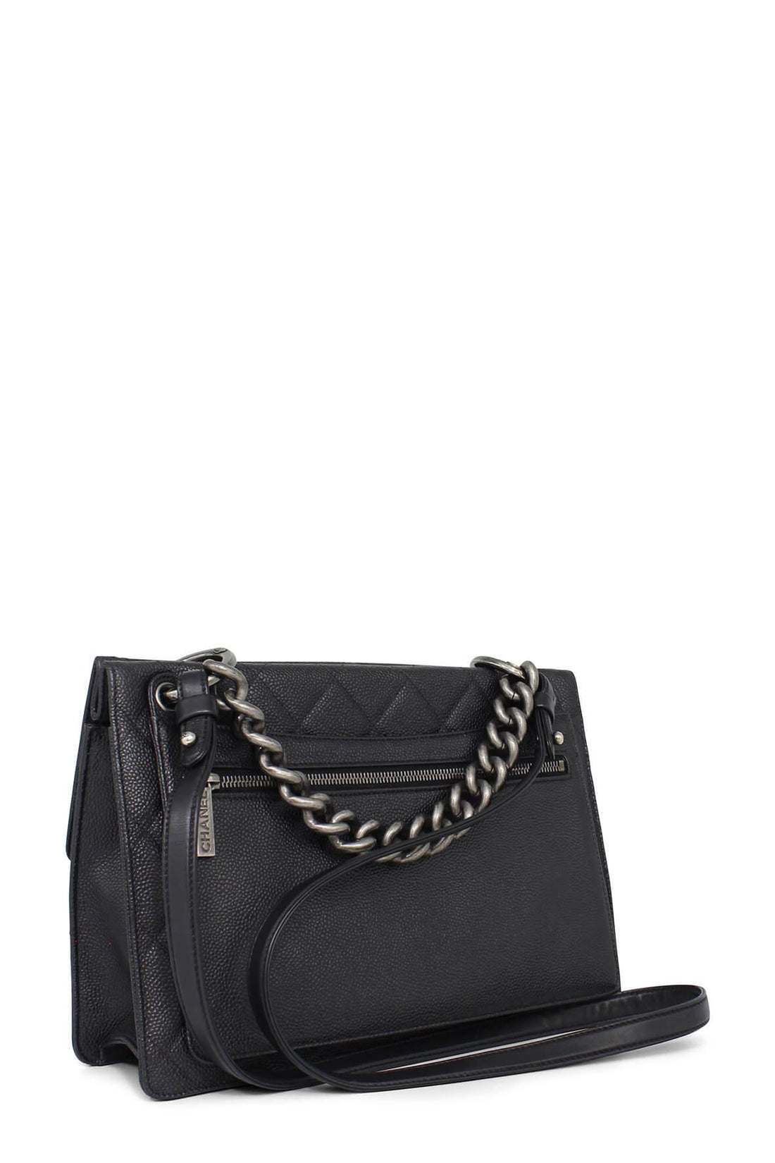 Quilted Caviar Jumbo Shoulder Bag with Flap Pocket Black