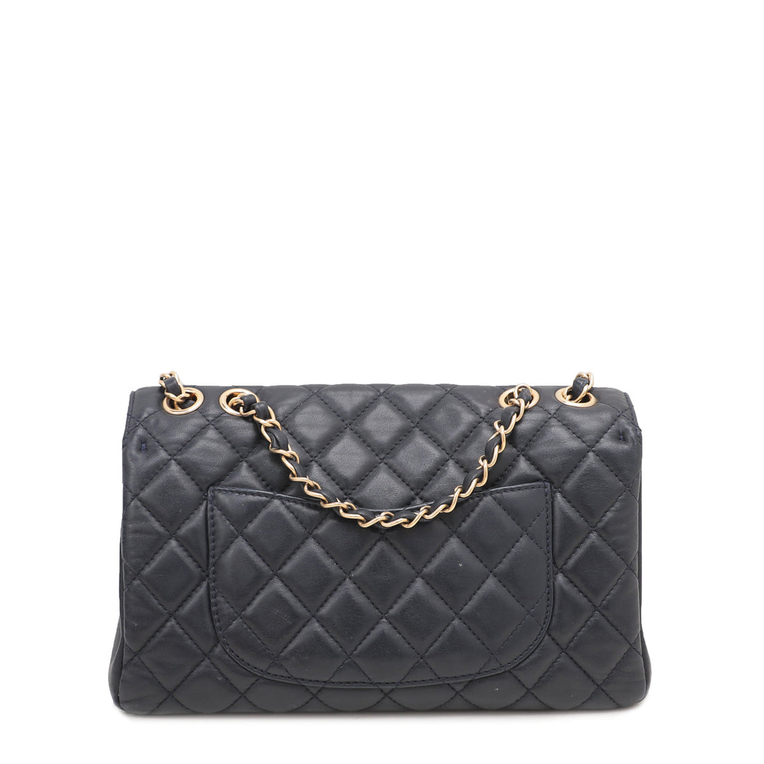 Material: Navy Blue Quilted Lambskin Leather Hardware: Gold Features: Pockets: Interior Zipper Pocket, Exterior Flat...