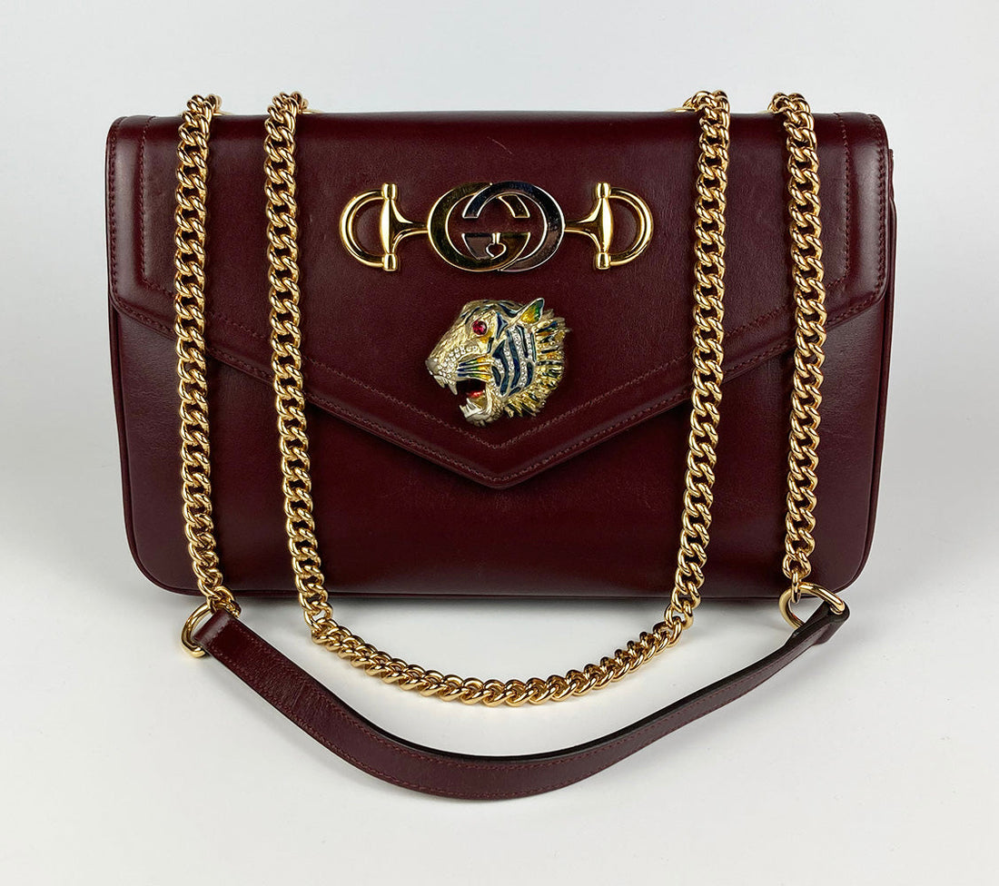 Gucci Rajah Medium Shoulder Bag in good condition. maroon calfskin exterior trimmed with gold chain...