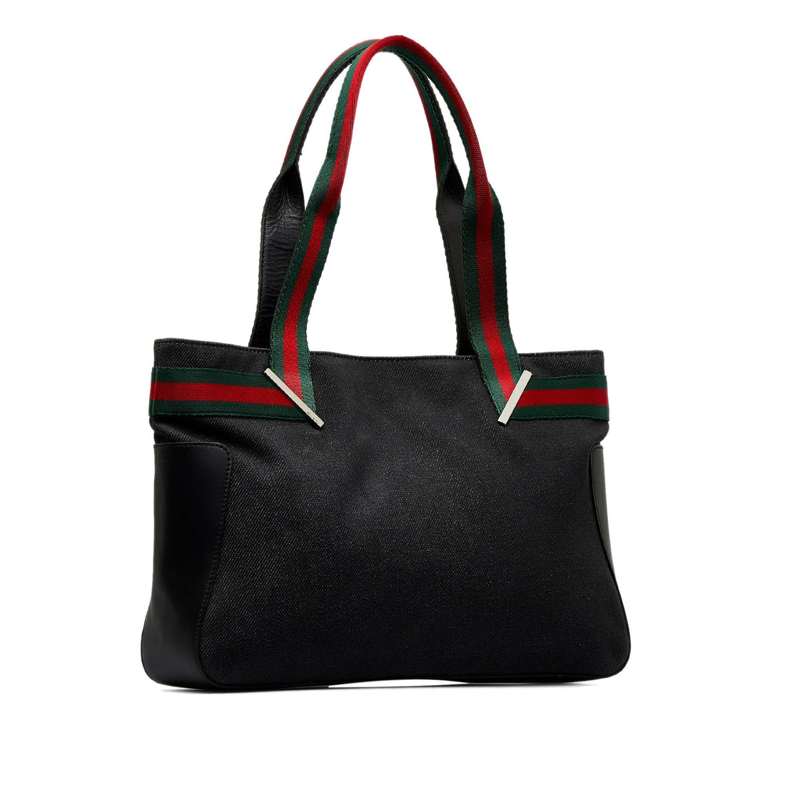 Product Details: Black Gucci Web Tote. This tote bag features a denim body with leather...