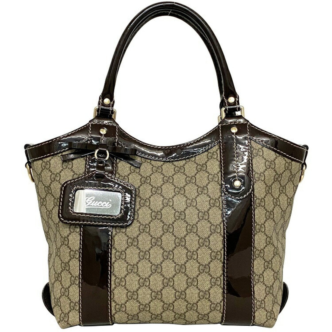 Gucci Tote Bag Beige Brown GG Supreme 203521 PVC Patent Leather GUCCI Handbag Plus Charm Enamel Ribbon Ladies