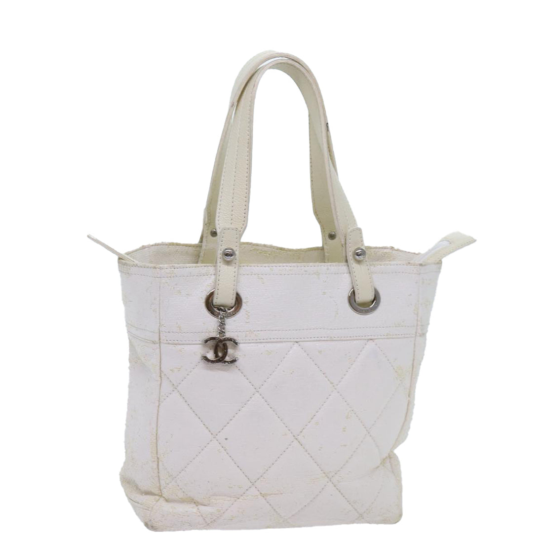 CHANEL Paris Biarritz PM Tote Bag Coated Canvas White CC Auth 70278