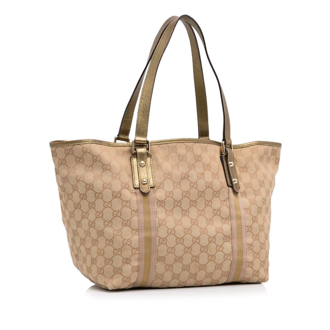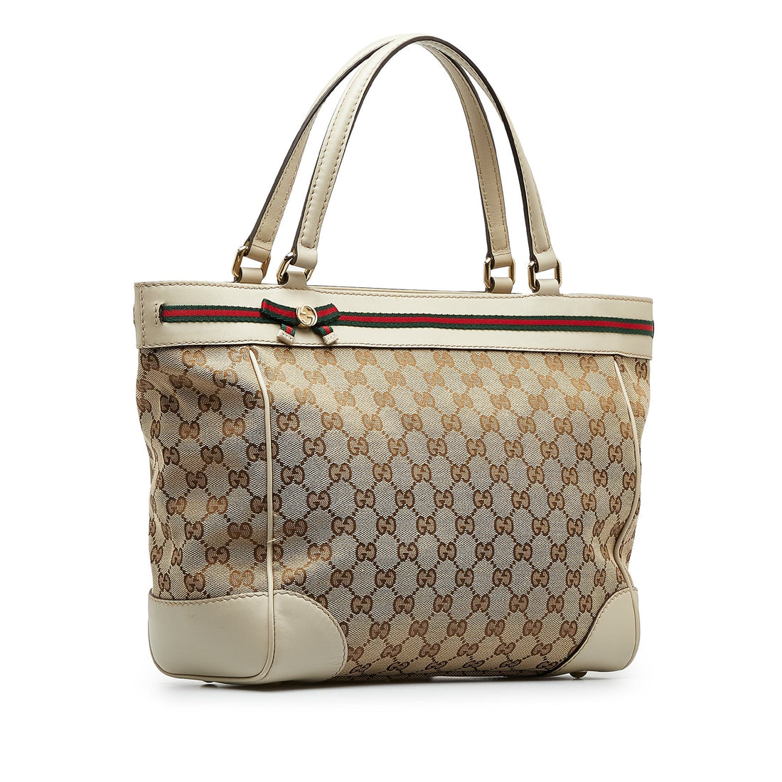 Product Details: Brown Gucci GG Canvas Jolicoeur Tote. The Jolicoeur features a canvas body, flat...