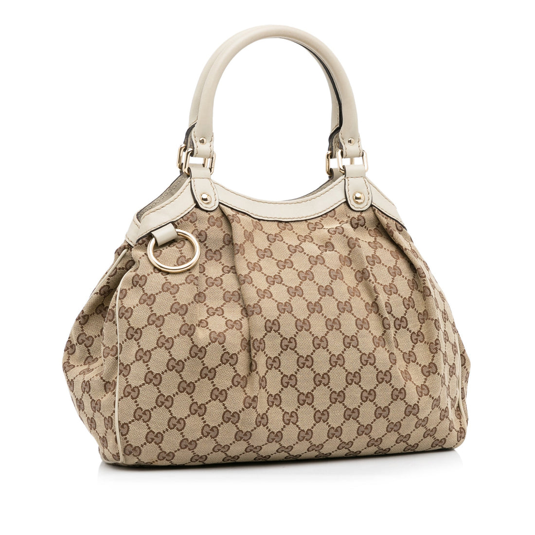 Product Details: Brown Gucci GG Canvas Sukey Tote. The Sukey tote bag features a canvas...