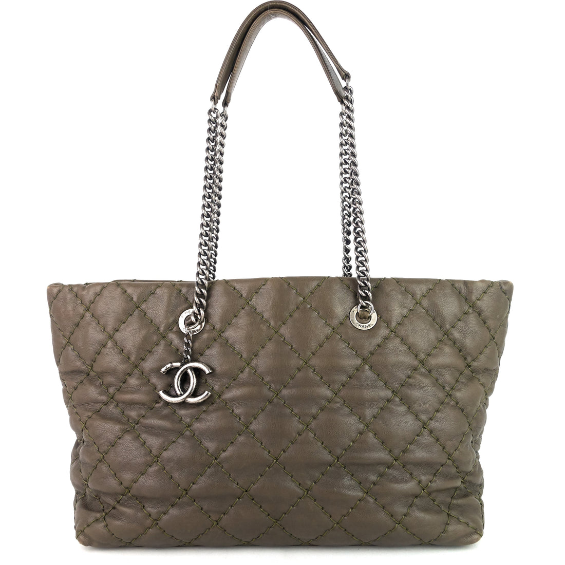 Prominent diamond quilting distinguishes a calfskin leather tote that's packed with a variety of pockets...