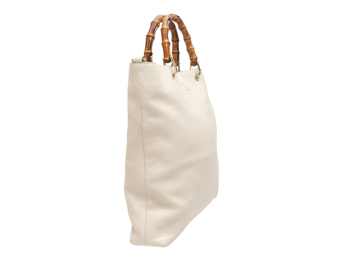 Product Details:�White Gucci Leather & Bamboo Shopping Tote. This�shopping tote�features a�leather�body,�gold-tone hardware, dual bamboo top...