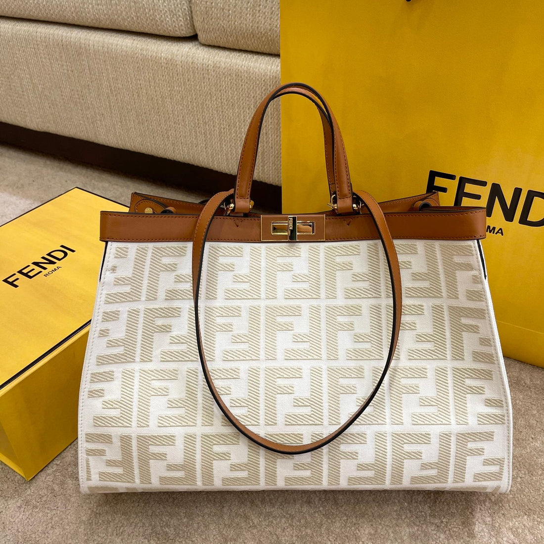 FI Peekaboo X-tote Bag Beige Canvas For Women, Women’s Handbags, Shoulder Bags 16.1in/41cm FF 8BH374