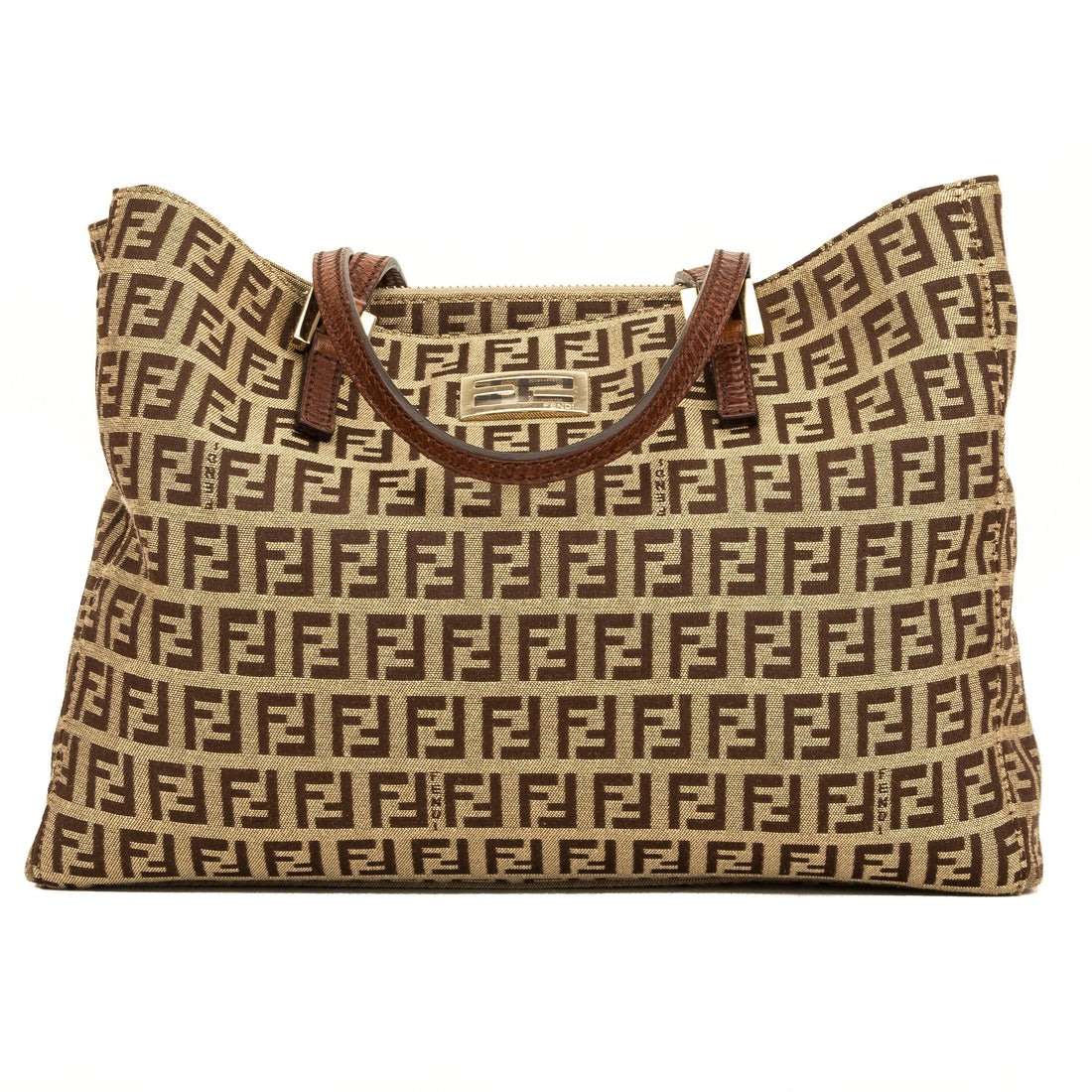 This , Fendi Zucchino Tote Bag features the classic FF mono exterior with beige leather...
