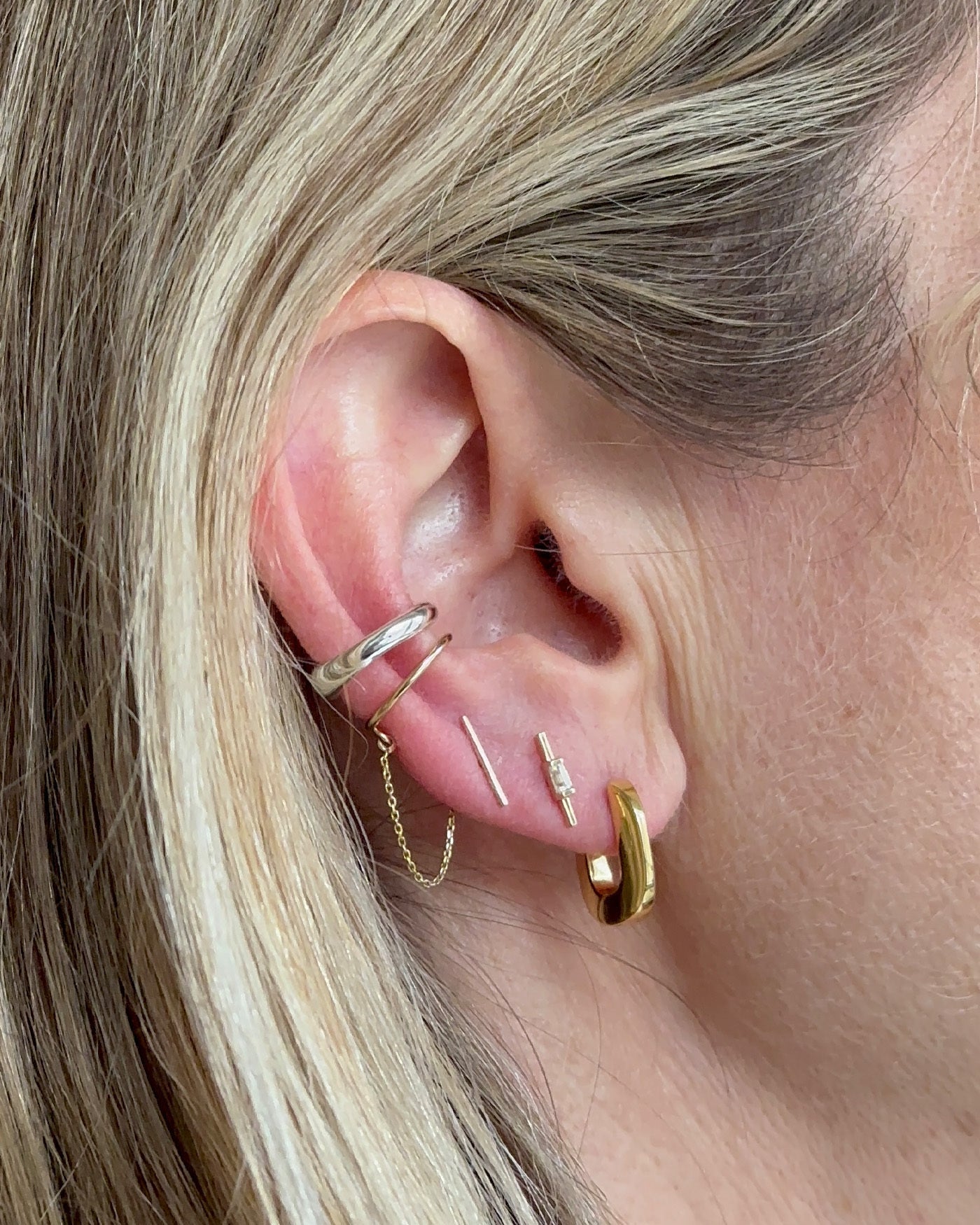 Also shown: Sila Ear Cuff Set, 14K Gold Ear Cuff with Chain, 14K Gold White Sapphire Stud, and Teeni Toni Huggie Earrings.