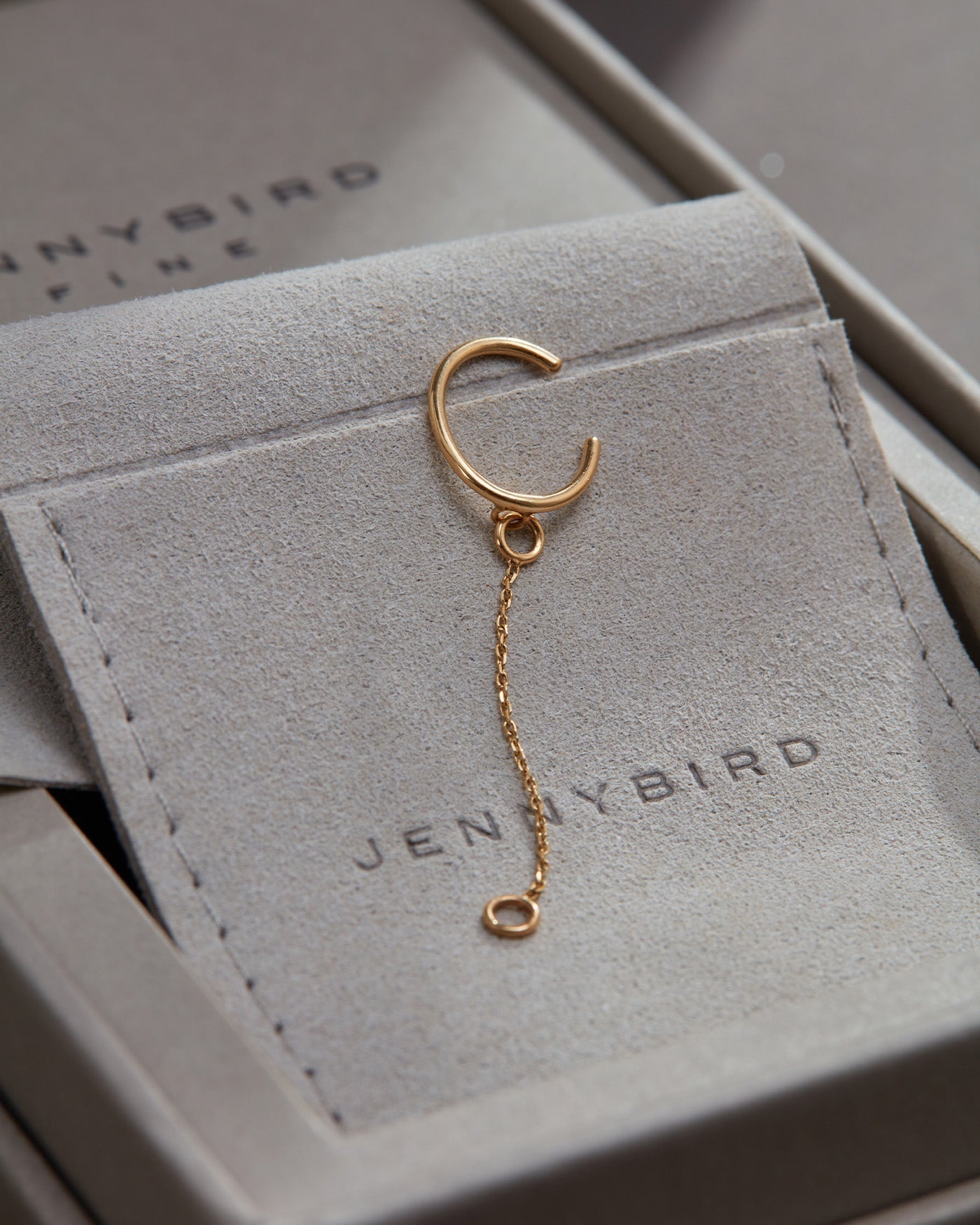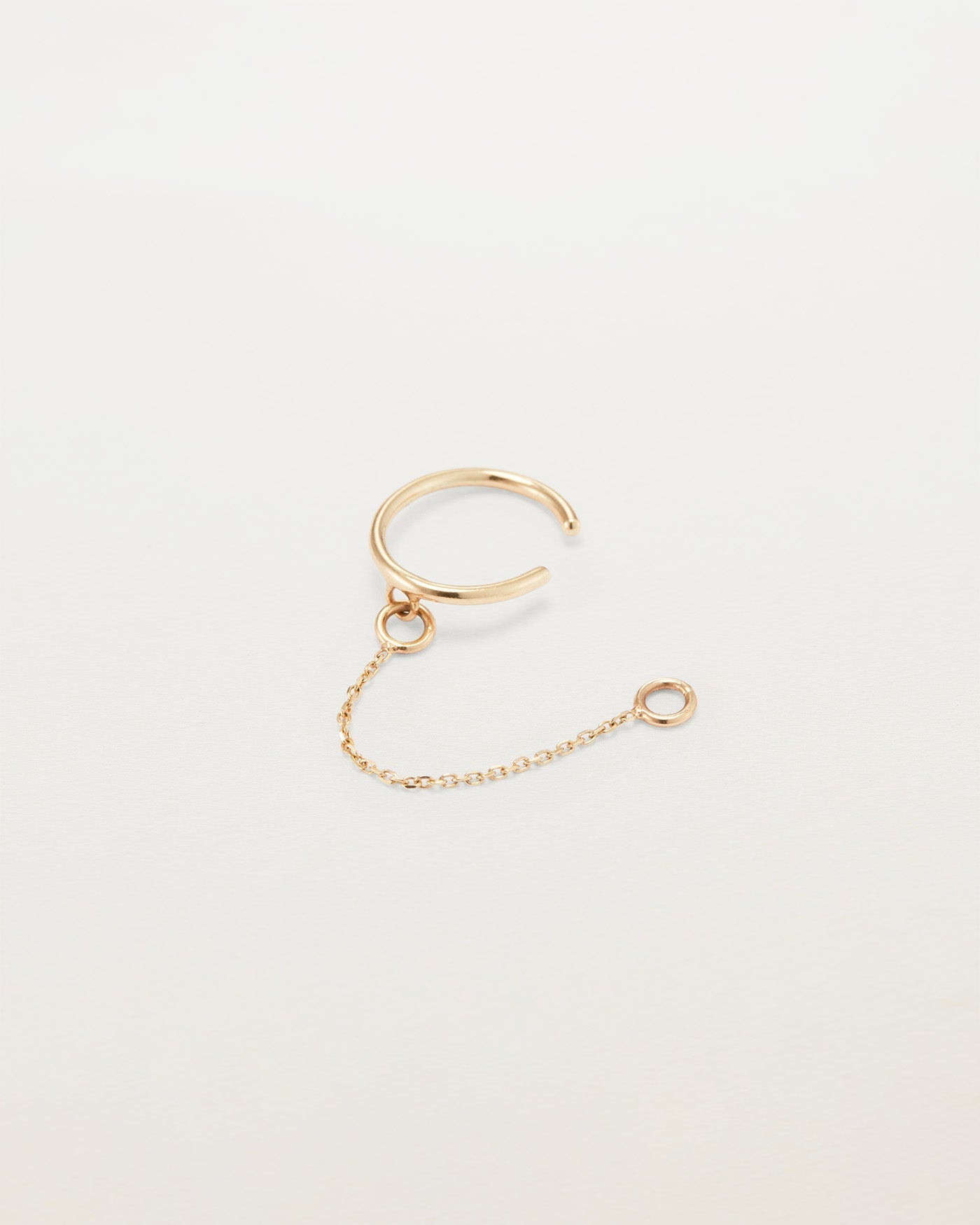 This ear cuff takes your ear stack to the next level. By combining a sleek 14K solid gold cuff with an edgy cable chain, it’s designed to work with existing earrings in your collection.