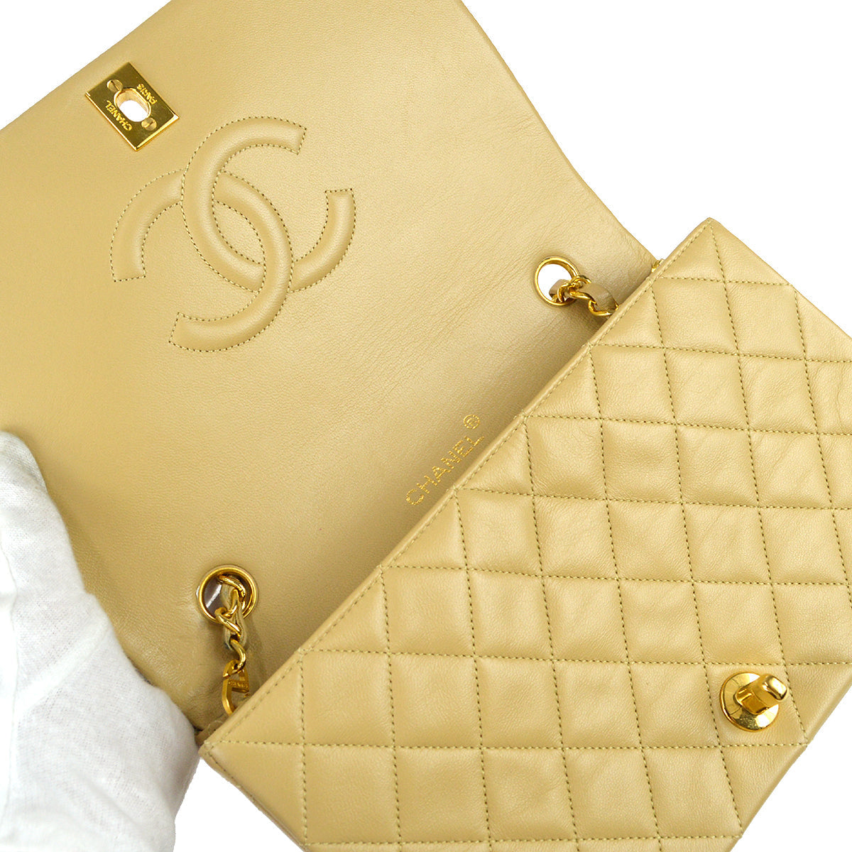 Chanel 1989-1991 Full Flap Chain Shoulder Bag Beige Lambskin