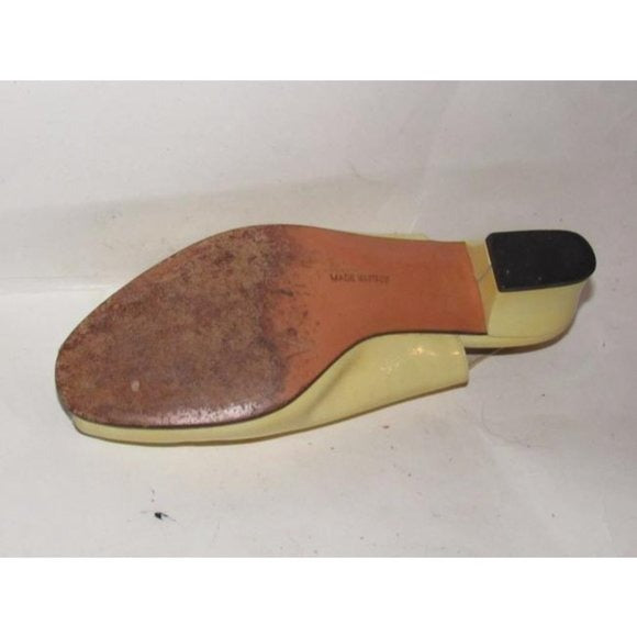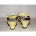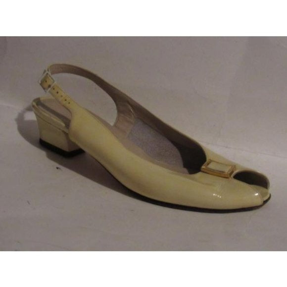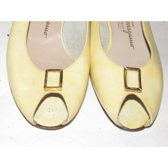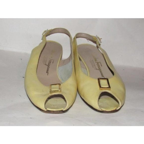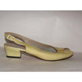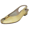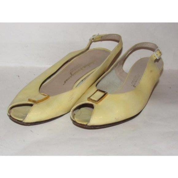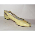 1960's, amazing, MOD Salvatore Ferragamo, size 6.5C, pale yellow patent leather, open toe, 2" chunkier heeled slingback sandals