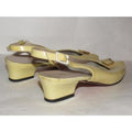The shoes are the perfect pair of heels that will go with almost any outfit! They have almond shaped open toes and 2" heels. The heels are made of pale yellow patent leather with a gold accent at the toes and a sling back heel. The design create