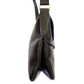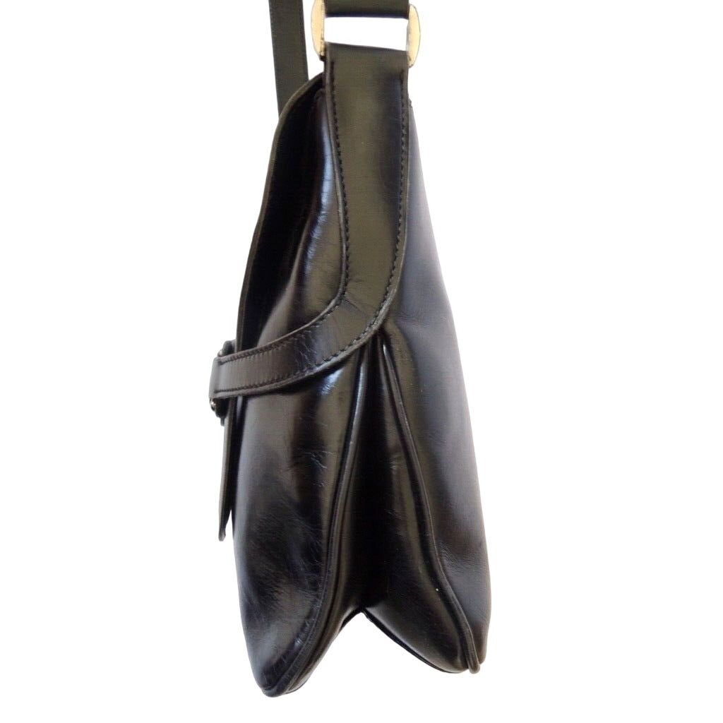 1970s Gucci saddle bag in black leather with muted gold hardware, an expandable bottom, wide shoulder strap, and burgundy leather lining