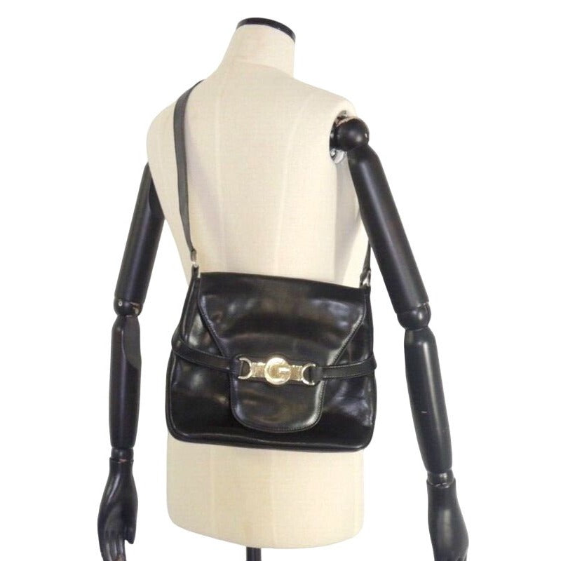 For sale is a vintage Gucci saddle bag in black leather with muted gold hardware, an expandable bottom, wide shoulder strap, and burgundy leather lining. I believe this is a 1970s era, rare Giorgio Gucci saddle bag style.
