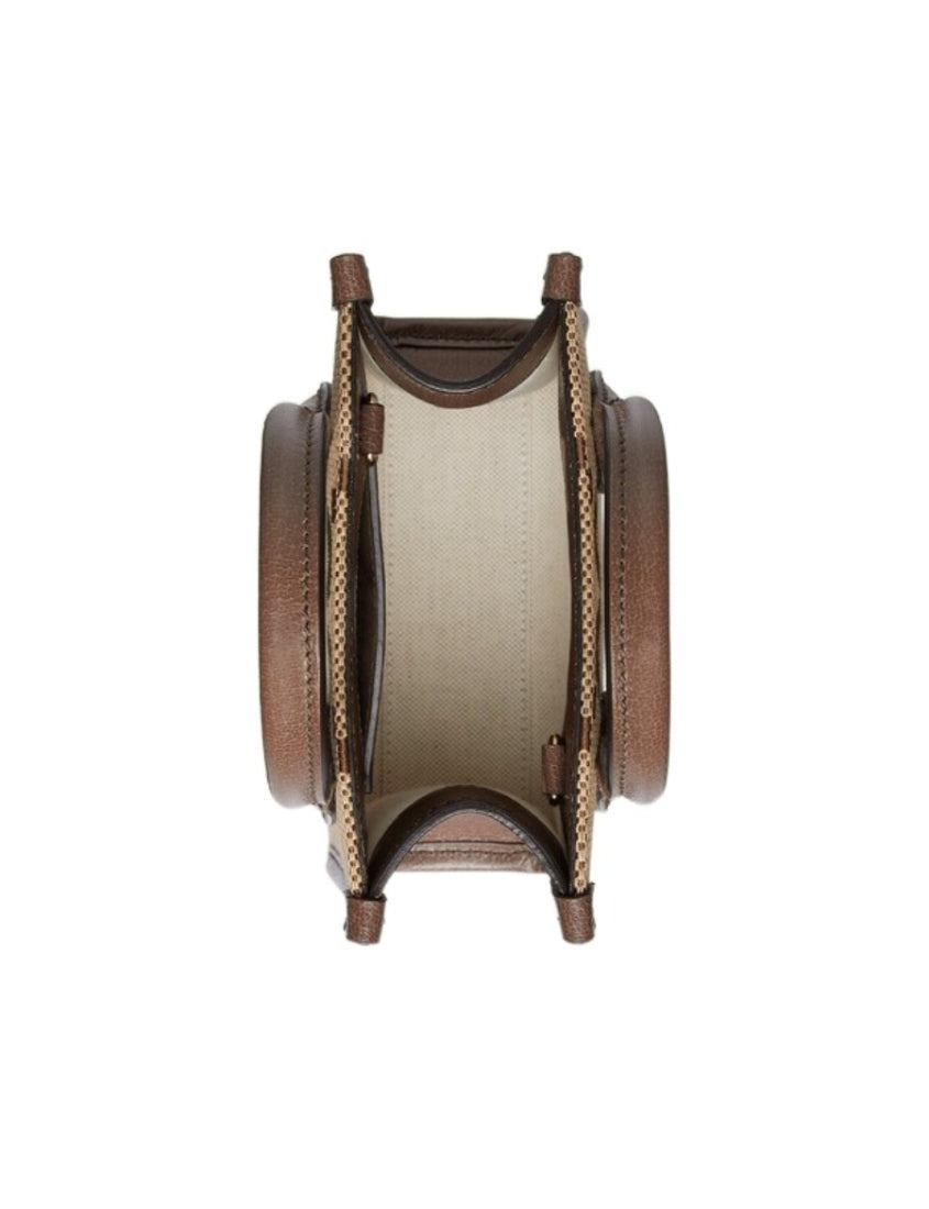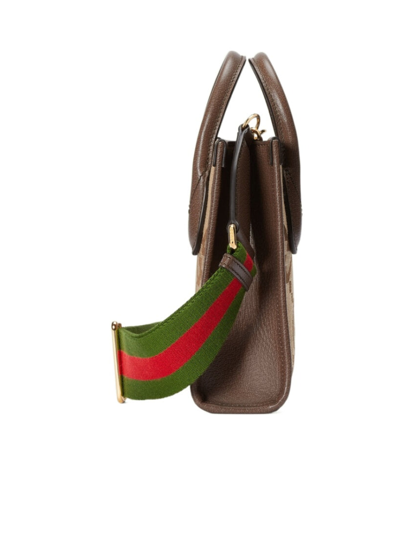 Jumbo GG mini tote with open mouth, jacquard GG monogram, brown leather piping, removable red and green webbing shoulder strap, 1 internal card compartment. (This item is packaged in a dust bag or box)