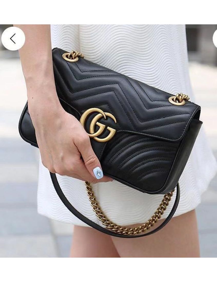 Black GG Marmont mini shoulder bag with wave pattern quilting with GG logo, vintage gold metal hardware and interior zipper pocket. (This item is packaged in a dust bag or box)