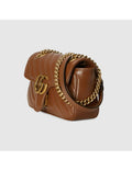 Brown GG Marmont mini shoulder bag with antique gold tone hardware, double G logo, quilted design and spring clasp flap. Antique gold tone hardware Double G interior open pocket for large size cell phone Sliding chain can be adjusted for a shoulder strap of about 55 cm or a top carry strap of about 30 cm in length. Can also be used as a crossbody bag. Spring buckle flap (this item is packaged in a dust bag or box)
