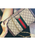 Beige, ebony Ophidia GG small shoulder bag, GG flower with lettering pattern, classic green and red webbing details, gold chain shoulder strap. Red and green webbing with gold tone accessories double G hand-painted inserts two compartments interior open pocket chain shoulder strap (43 cm high) magnetic buckle (this item is packaged in a dust bag or box)