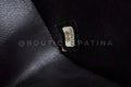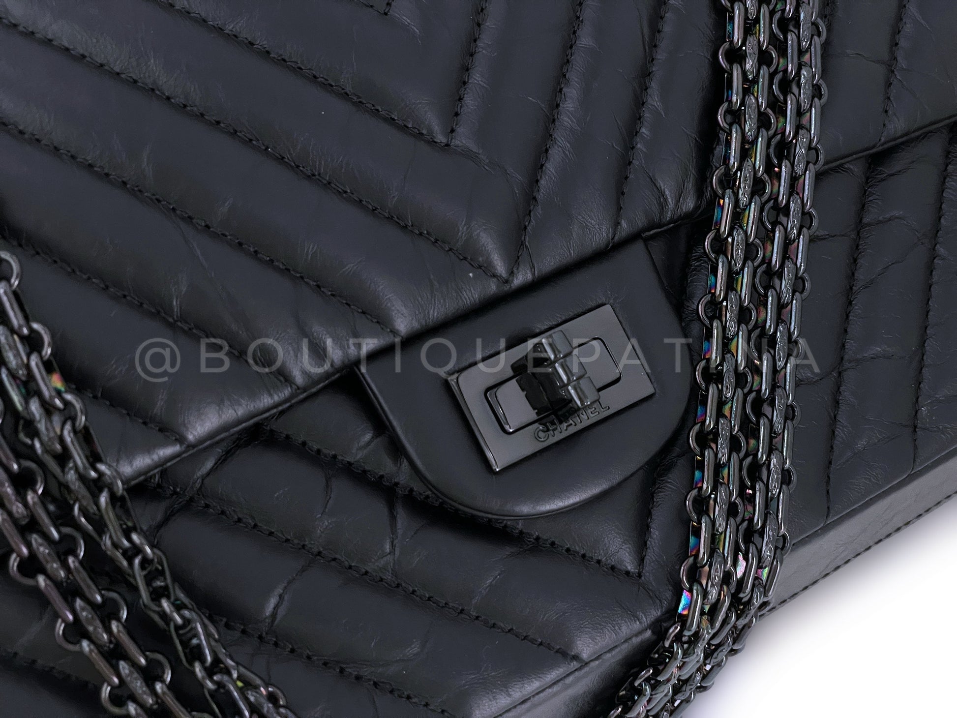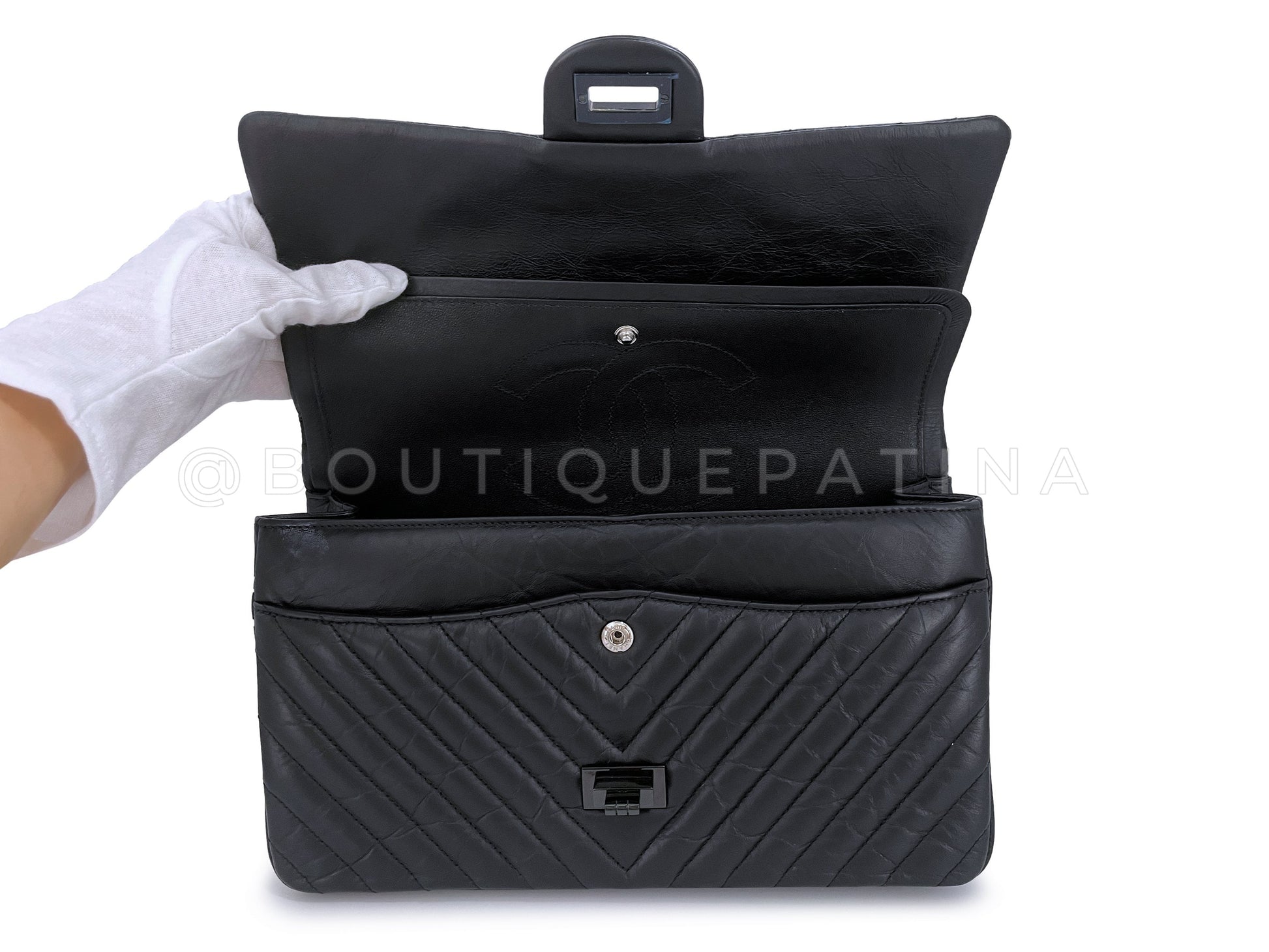 In Black aged calfskin and black metal hardware, and in the "V" shaped sleek chevron pattern. A true collectible for Chanel enthusiasts, if you know you know!