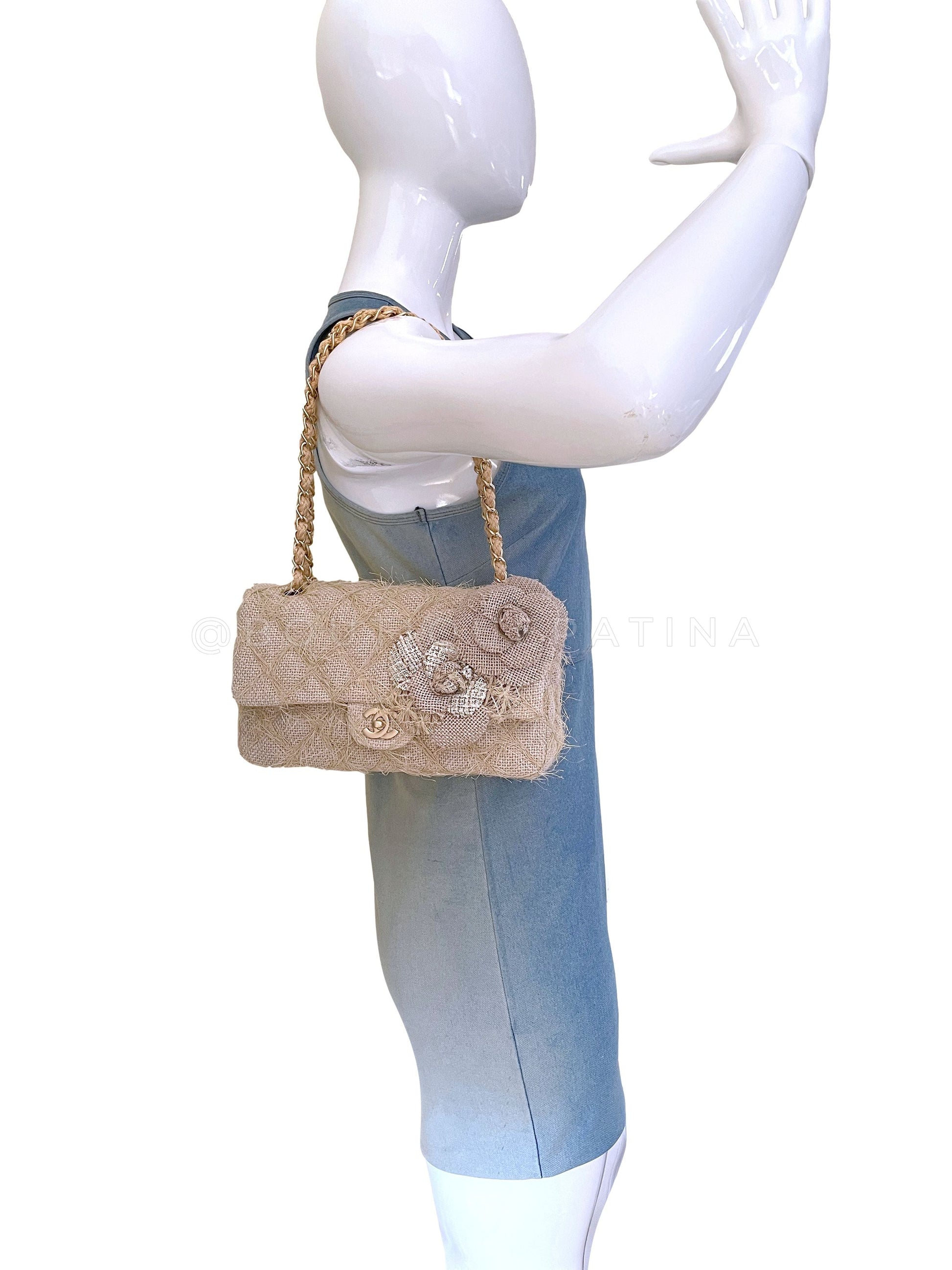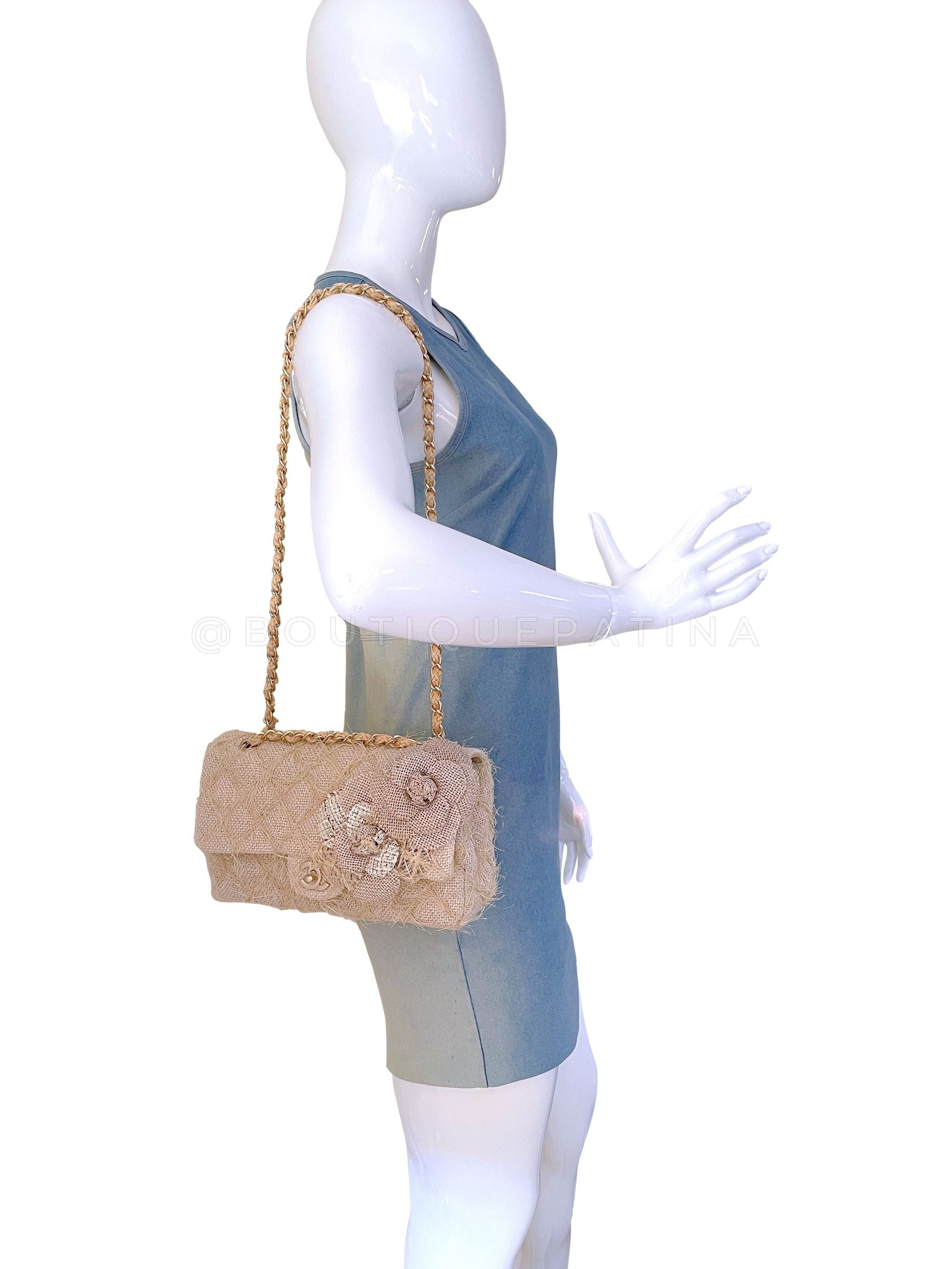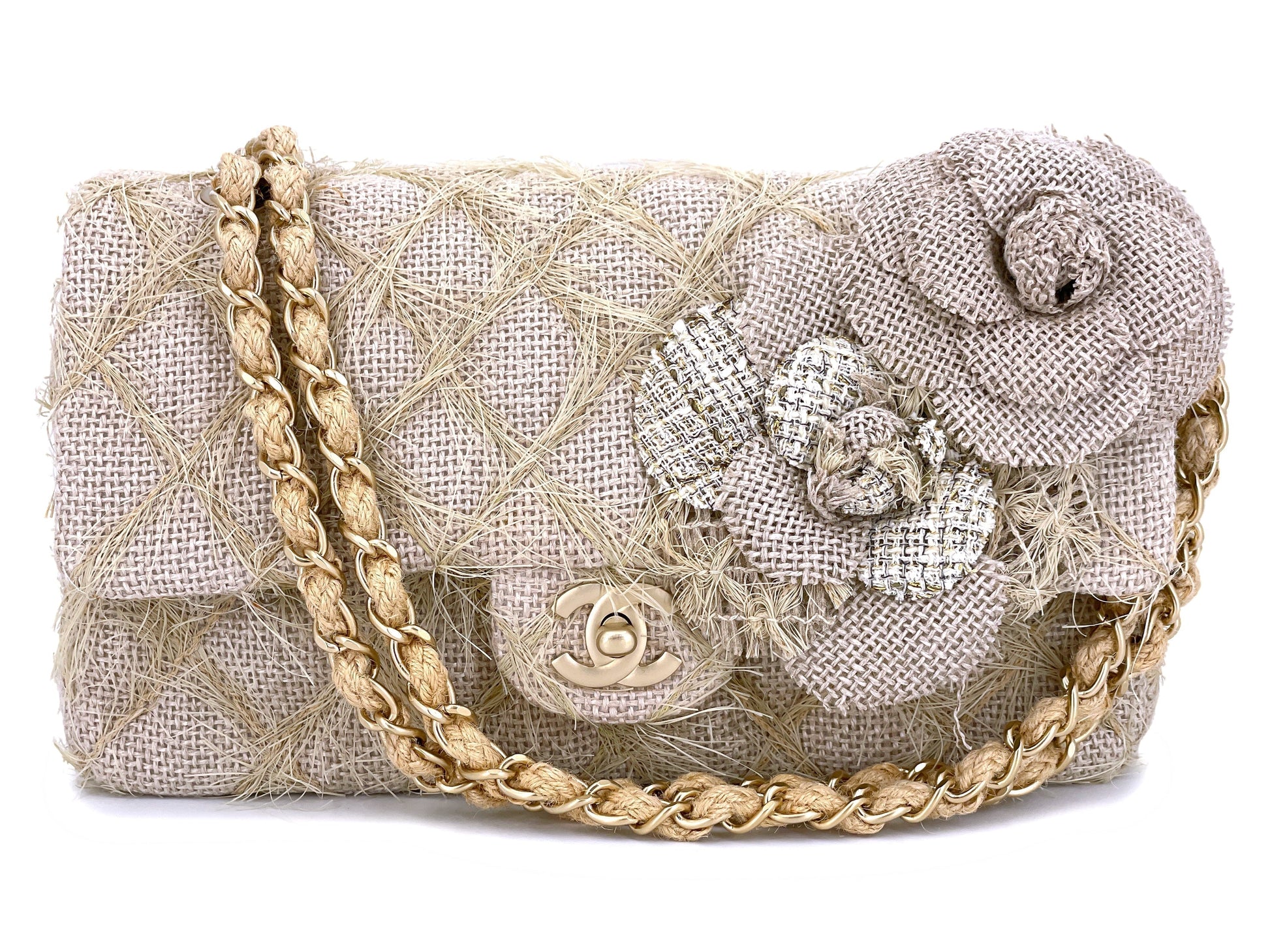 Chanel 2010 Taupe Beige Camellia Straw Raffia Classic Flap Bag GHW