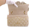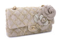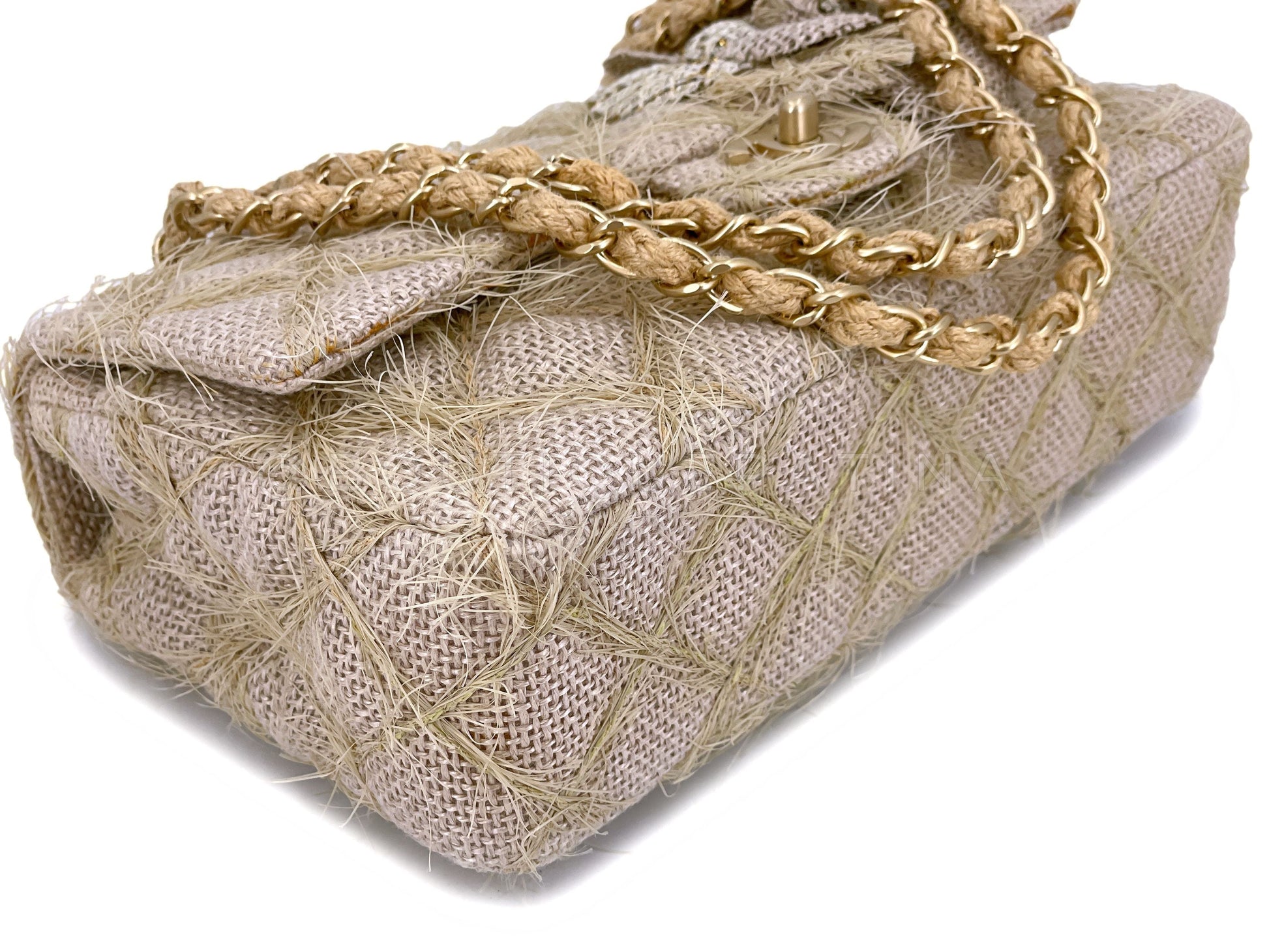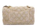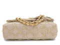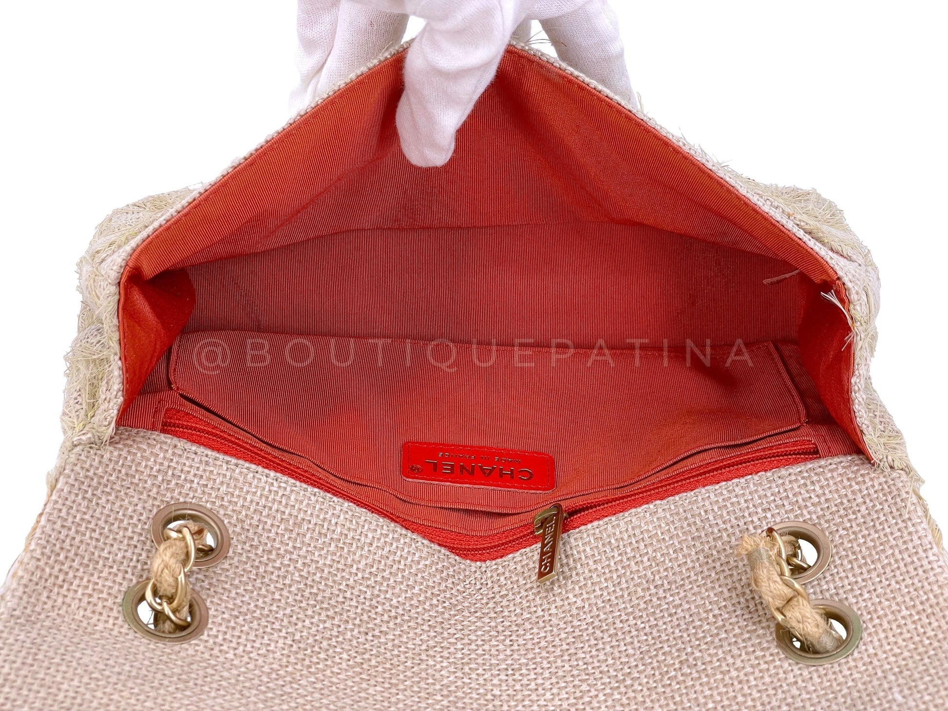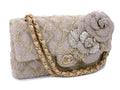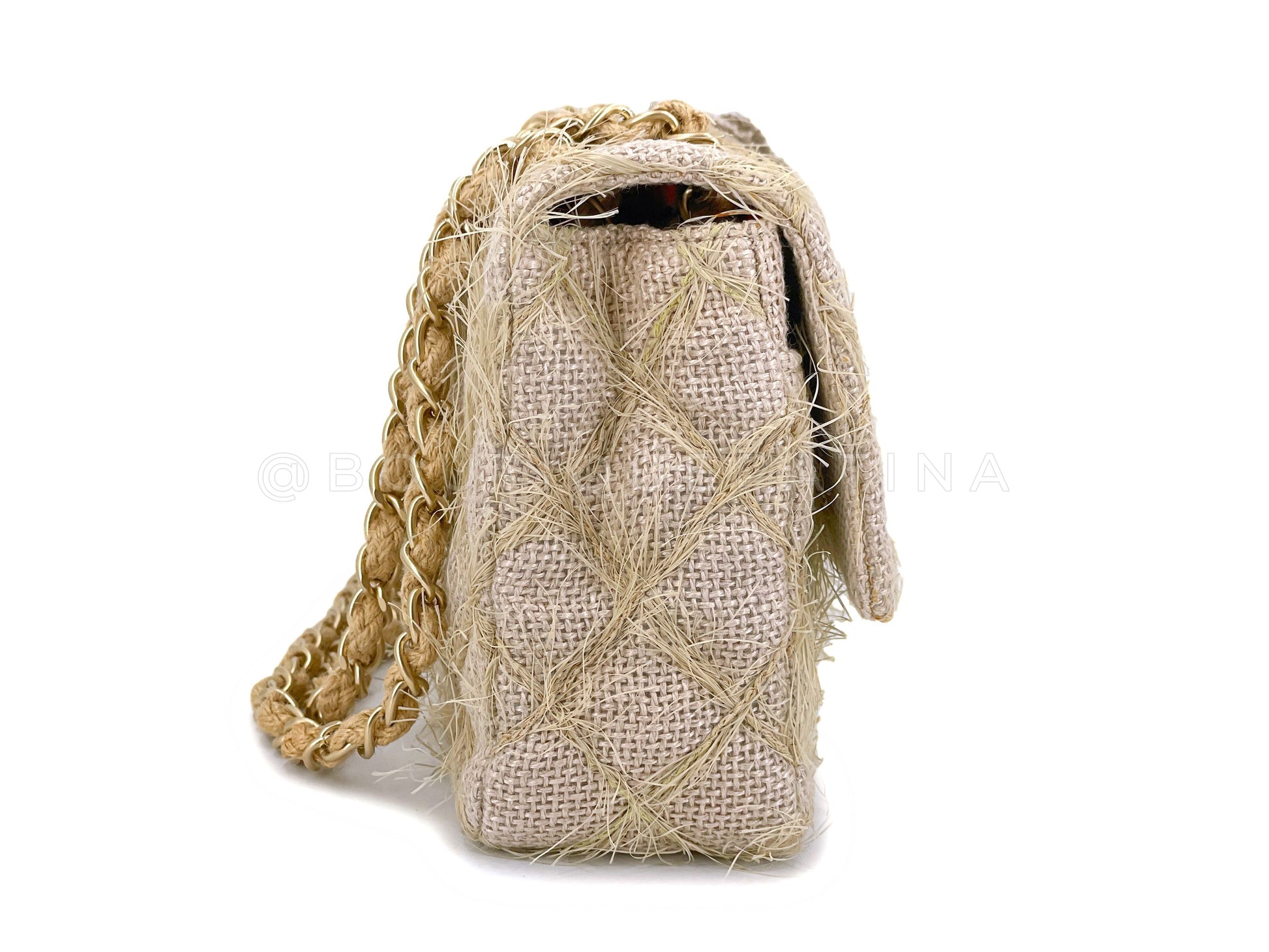 Chanel 2010 Taupe Beige Camellia Straw Raffia Classic Flap Bag GHW